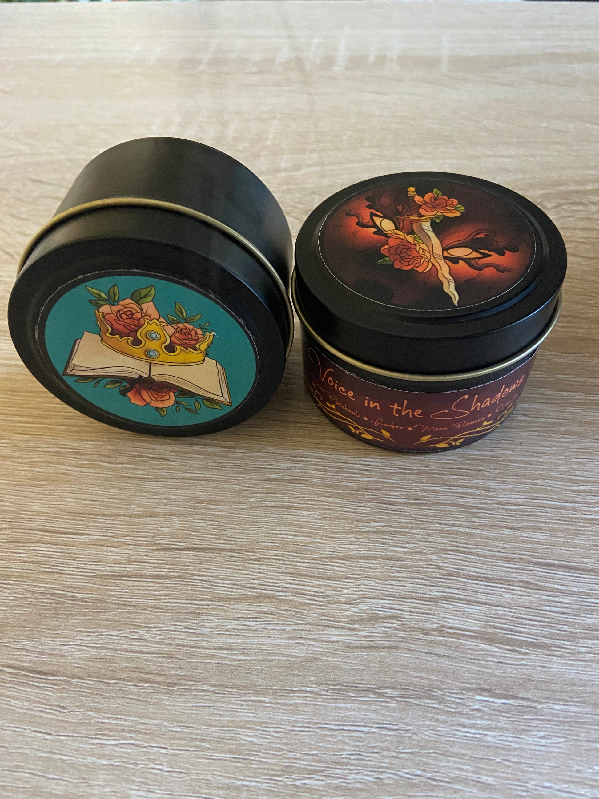 Signed copies of Shadow’s Voice and Shadow’s Past, and Shadow’s Fall, both of the character themed candles, Rose and King Micah, and both of their character prints.